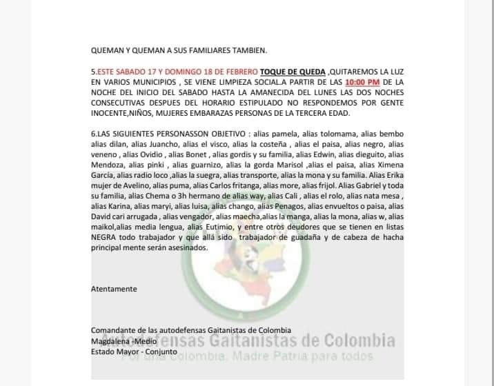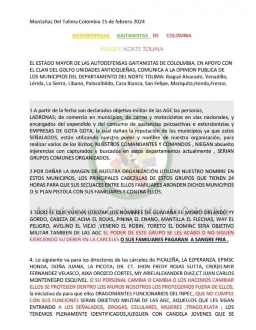En este caso, el comunicado expedido por el llamado estado mayor de las autodefensas Gaitanistas con apoyo del Clan Golfo, señalan su presunta irrupción en municipios como Ibagué, Alvarado, Venadillo, Lérida, Mariquita y Honda, entre otros, donde amenazan con un limpieza social, y declaran objetivo militar a reconocidos delincuentes, y personas no de su agrado.