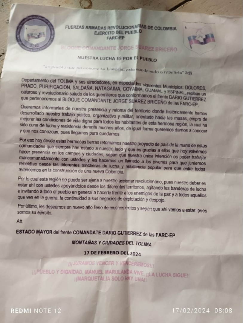 En efecto, en un comunicado suscrito por el llamado estado central del frente Comandante Darío Gutiérrez de las Farc-EP, se indica que: “Queremos informarles sobre nuestra presencia y retoma del territorio donde históricamente hemos desarrollado nuestro trabajo político, organizativo y militar…”, y señalan tener como objetivos de su accionar subversivo a los municipios de Dolores, Prado, Purificación, Saldaña, Natagaima, Coyaima, Guamo y El Espinal. De hecho, este portal tuvo conocimiento que en el municipio de Prado, especialmente en el sector turístico de la represa, ya se están registrando extorsiones y el reparto de panfletos amenazante a la población.