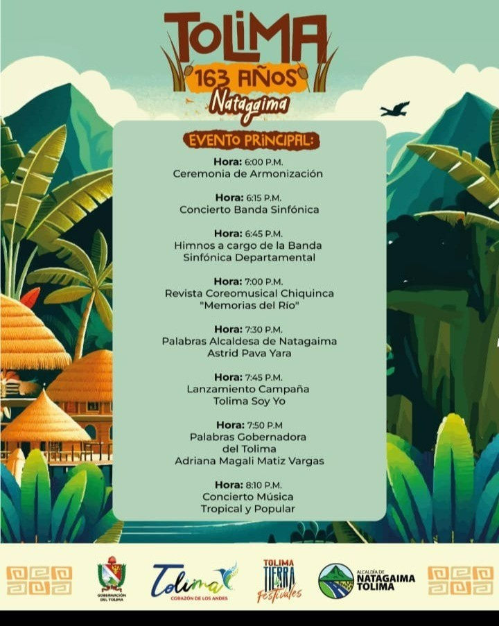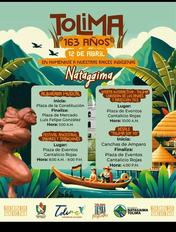 Por su parte, el evento central que organiza la Secretaría de Cultura y Turismo del Tolima se realizará en Natagaima con un cronograma durante todo el día, en el que se incluyen alboradas, oferta interactiva, desfile artístico del sur del Tolima y el Festival de Ancestros, Sabores y Tradiciones.