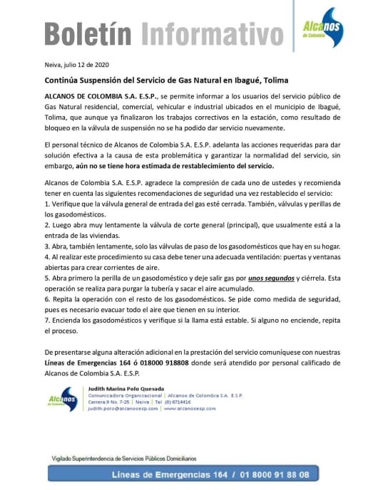Por lo tanto, Alcanos de Colombia hace recomendaciones a los usuarios para que sean tenidas en cuenta una vez sea restablecido el servicio.