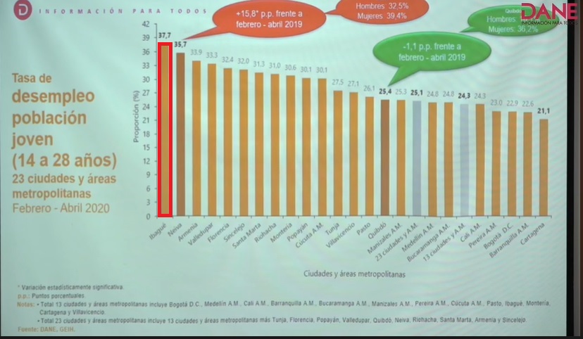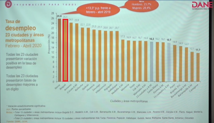 Por ciudades, Ibagué ocupó el segundo puesto en desempleo, con una cifra de 25.1 por ciento. En las 13 ciudades y áreas metropolitanas fue del 23.5 por ciento, lo que significa un incremento de 12.4 por ciento en comparación al mes de abril de 2019. Según el DANE, son las cifras más altas de la década.