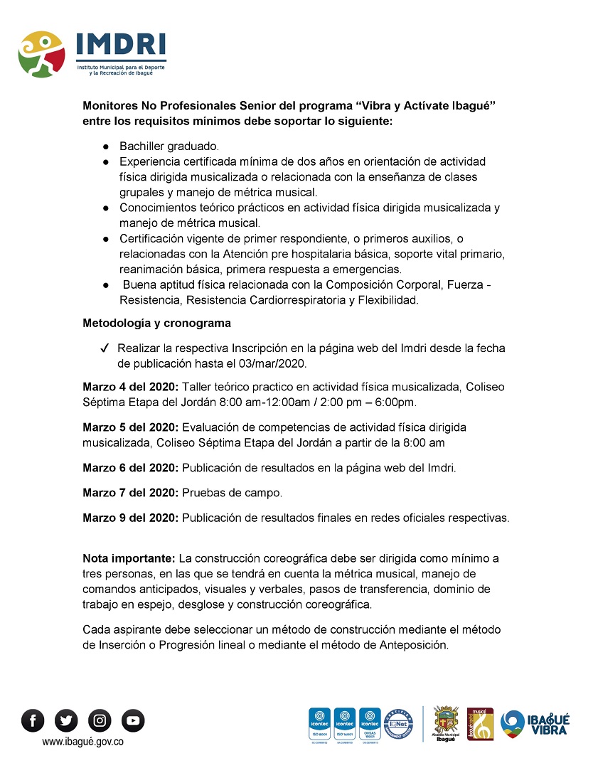 Los interesados en postularse, podrán hacerlo a través de la página web www.imdri.gov.co; es de resaltar que esta convocatoria cerrará el próximo 3 de marzo. Para conocer los requisitos y condiciones, hacer click en el este enlace.