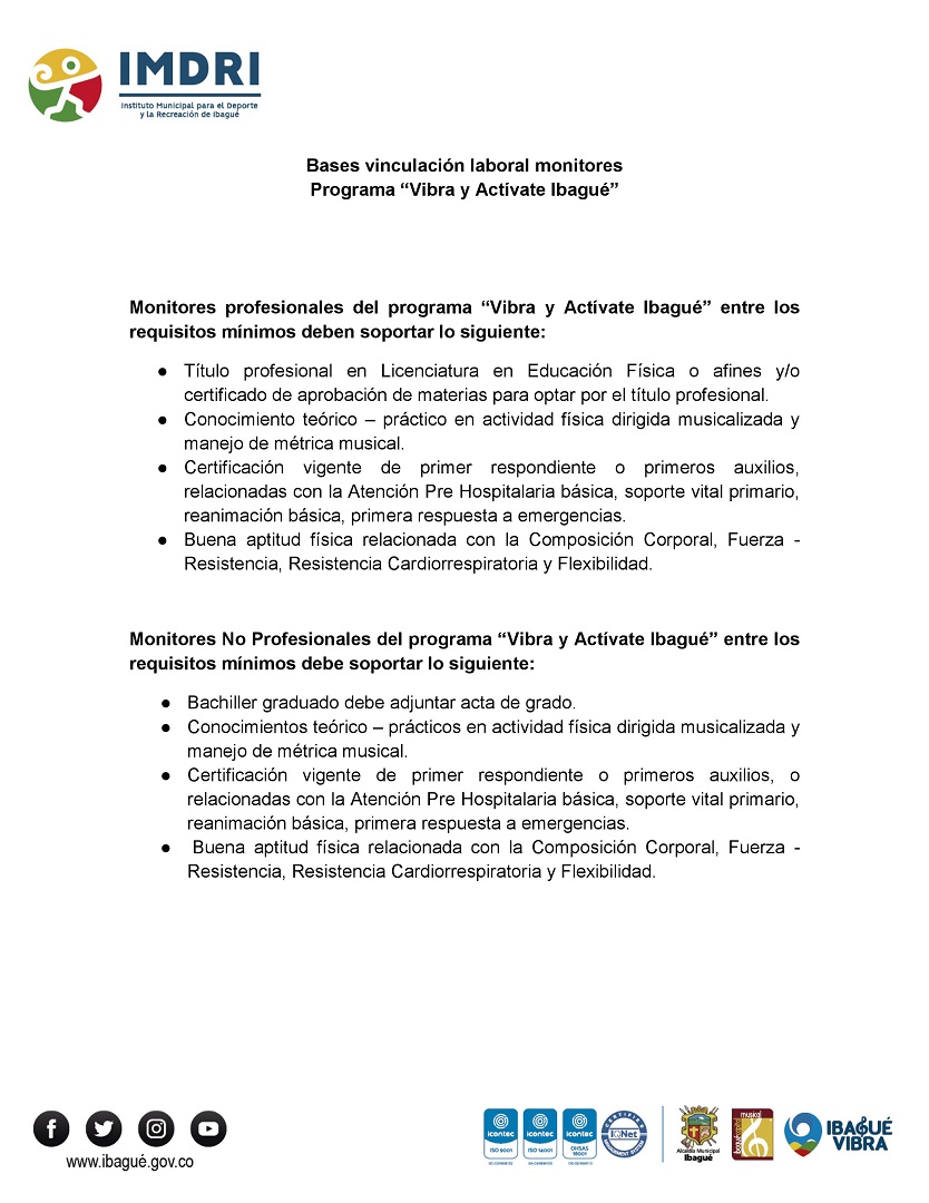 Instituto Municipal para el Deporte y la Recreación de Ibagué Imdri, abrió convocatoria pública para la vinculación de monitores que apoyarán diferentes procesos deportivos en la capital tolimense.