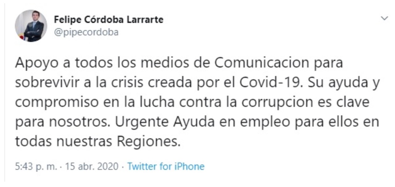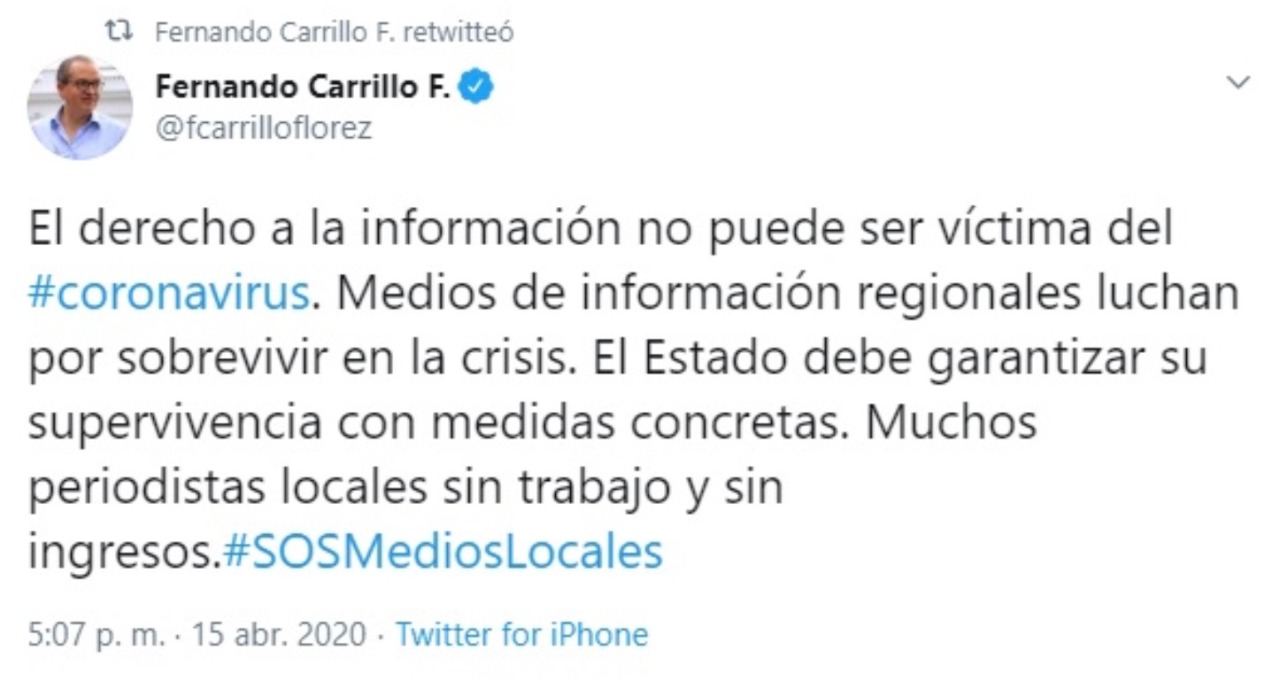 Cabe recordar que en su momento el Procurador Nacional Fernando Carrillo a través de un trino dijo que el derecho a la información no puede ser víctima del coronavirus. Medios de información regionales luchan por sobrevivir en la crisis.