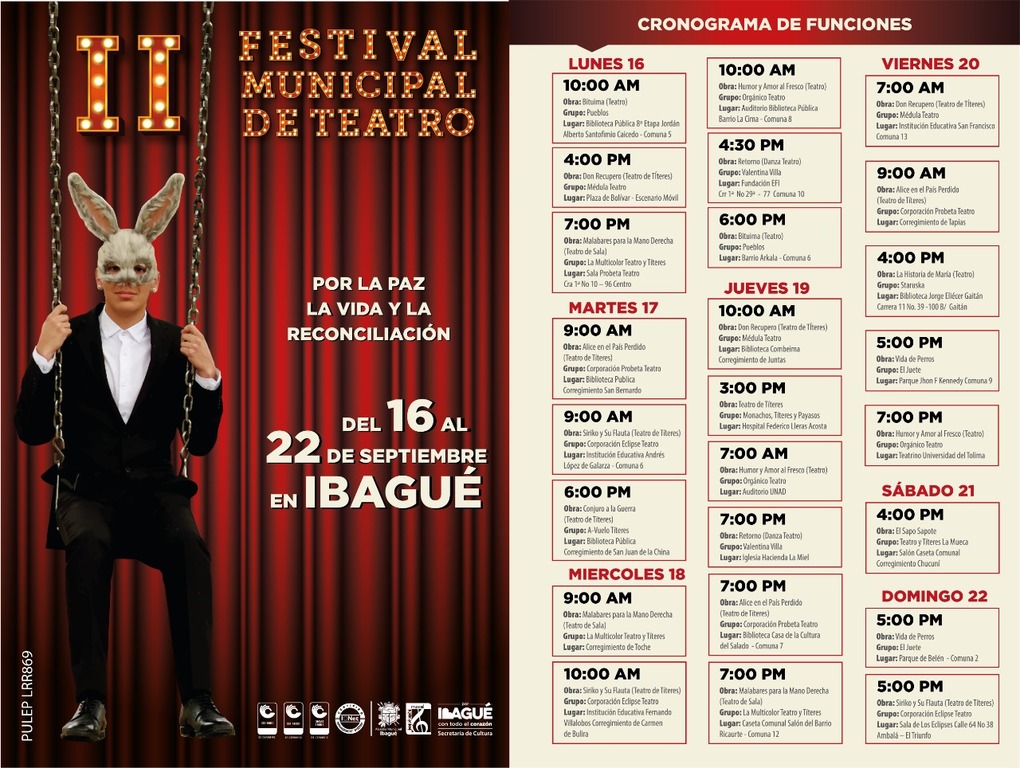 Hasta el domingo 22 de septiembre se presentarán diferentes funciones, en distintos puntos de la ciudad, que hacen parte del II Festival Municipal de Teatro que este año tiene como lema “Por la paz, la vida y la reconciliación”. Son cerca de 25 actividades gratuitas que también se estarán llevando a algunas instituciones educativas.