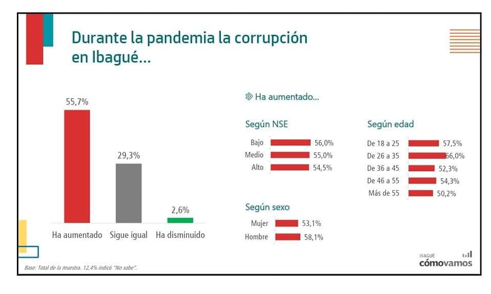 Asimismo, la encuesta revela que, el 55,7% de los ibaguereños creen que la corrupción ha aumentado durante la pandemia. El 29,3% consideran que sigue igual la corrupción y, solo en 2,6% opinan que ha disminuido.
