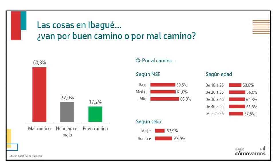La más reciente encuesta de percepción ciudadana, hecha por el colectivo 'Ibagué Cómo Vamos', demuestra que el 60,8% de los ibaguereños opinan que la ciudad "va por mal camino". Mientras que, el 22,0% opinan que no va por bueno ni por mal camino, y solo el 17,2% consideran que "va por buen camino".