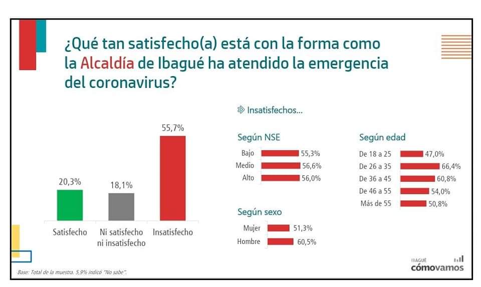 La encuesta también evidencia que, el 55,7% de los ibaguereños están insatisfechos con la manera como la Alcaldía ha atendido la emergencia del coronavirus. A su vez, el 20,3% están satisfechos, y el 18,1% están ni satisfechos ni insatisfechos. Las más inconformes con la gestión de la Alcaldía son las personas entre los 26 y 35 años, con un 66,4%.