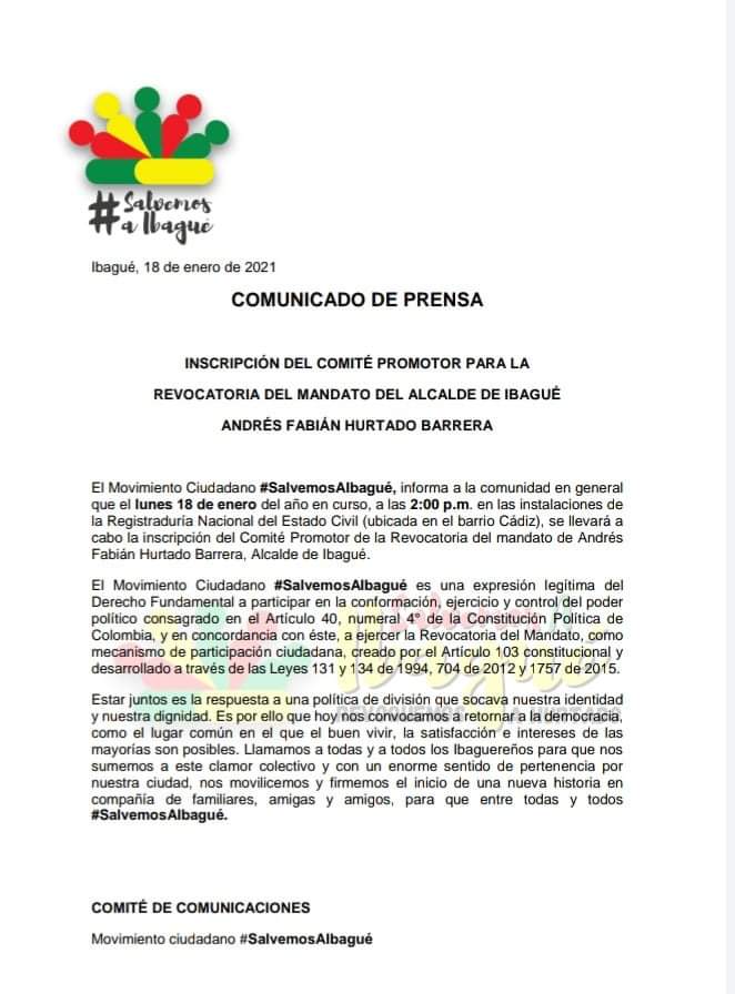 Agrega que “Nos unimos a la propuesta de revocatoria de mandato que un grupo de ciudadanos adelantará en la ciudad de Ibagué, para exigir un cambio de gobierno que propenda por el bienestar de la ciudadanía y no por los intereses de un sector político”.