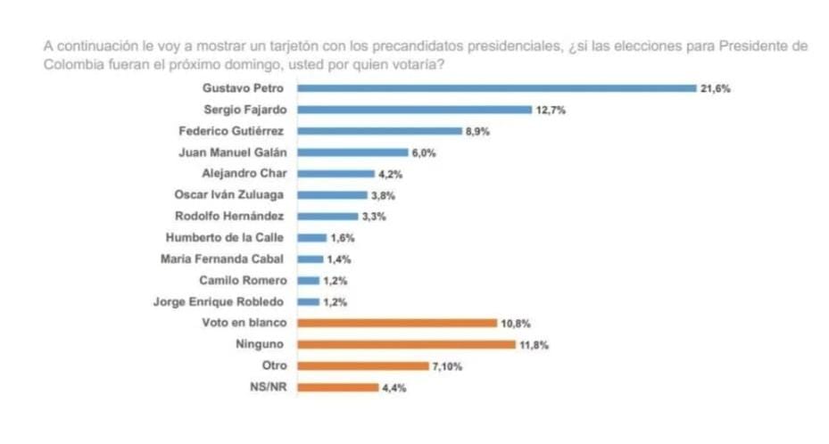 Ante la pregunta de “¿Si las elecciones para presidente de Colombia fueran el próximo domingo, usted por quién votaría?”, el 21,6 % de los encuestados dijo que votaría por Gustavo Petro, mientras el 12,7 % respondió que apoyaría a Sergio Fajardo.