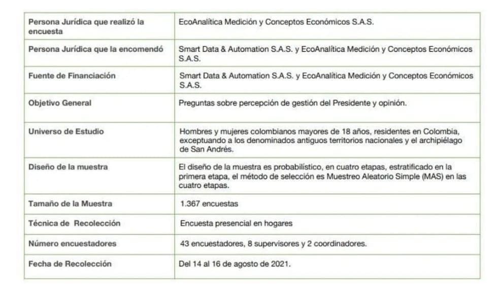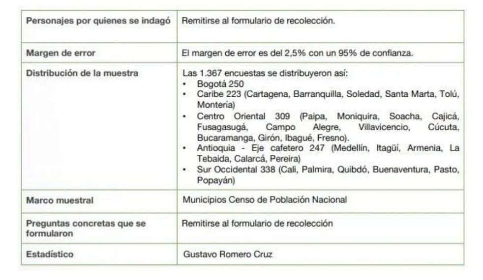 La encuesta que fue realizada entre los pasados días 14 y 16 de agosto, con una muestra de 1.367 personas, fue encomendada por Smart Data & Automation. El margen de error es del 2.5& con un 95% de confianza. Dentro de los lugares escogidos para la encuesta en el Tolima aparece Ibagué y el municipio de Fresno.