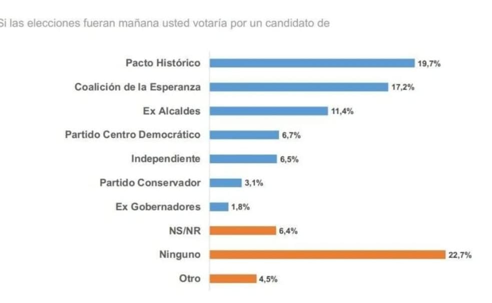 A la pregunta de, si las elecciones fueran mañana, usted votaría por un candidato de qué partido. El 19.7% de los encuestados respondió que por el Pacto Histórico; el 17.2% por alguien de la Coalición de la Esperanza; el 11.4% por uno de los exalcaldes (Gutiérrez, Peñalosa y Char) y el 6.7% por el aspirante del Centro Democrático. Un 6,5 %, a los independientes; 3,1 % , al Partido Conservador; y un 1,8 % aseguró que respaldaría a exgobernantes. El 22.7% dijo que por ninguno.