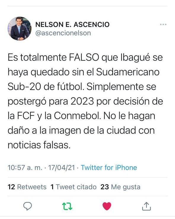 Por su parte, el periodista deportivo, Nelson Enrique Ascensio, aclaró que "es falso que Ibagué se haya quedado sin el Sudamericano Sub 20 de Fútbol. Simplemente se postergó para 2023 (...) No le hagan daño a la imagen de la ciudad con noticias falsas".