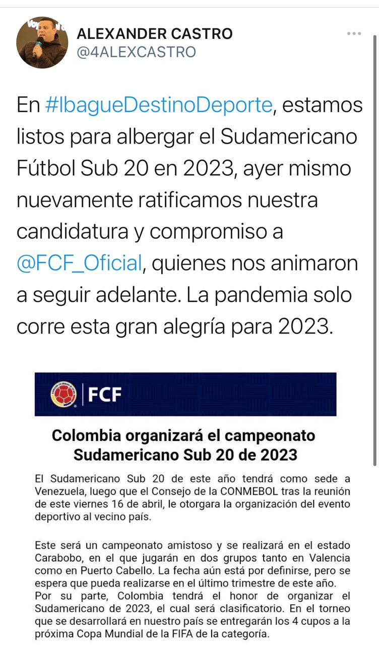 En ese orden, Indeportes Tolima a través del gerente Alexander Castro, escribió en su cuenta de Twitter que "En Ibagué estamos listos para albergar el Sudamericano Futbol Sub 20 en 2023, ayer mismo nuevamente ratificamos nuestra candidatura y compromiso a @FCF_Oficial, quienes nos animaron a seguir adelante. La pandemia solo corre esta gran alegría para el 2023.