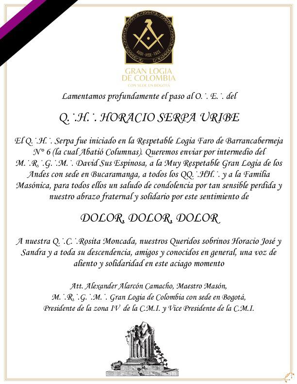 Con Serpa, se nos va al Oriente Eterno, un masón aprendiz, donde según él "tuve la oportunidad de ver la luz en territorio santandereano, con la muy especial ocasión de haber conocido no solamente los fundamentos de la institución sino a muchos y muchas de quienes integran la masonería colombiana".