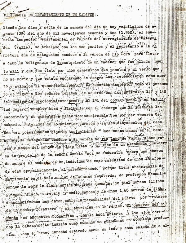 El 25 de agosto de 1.962, (hace 59 años)  apareció un cadáver  en  la berma de la carretera  que de Mateguadua conduce a Río Loro (Valle). El diligente inspector de Policía, avisado del hecho, apresuradamente juramentó y posesionó a dos peritos y, en compañía de su secretario, emprendió la  curiosa labor de hacer el levantamiento del  occiso.