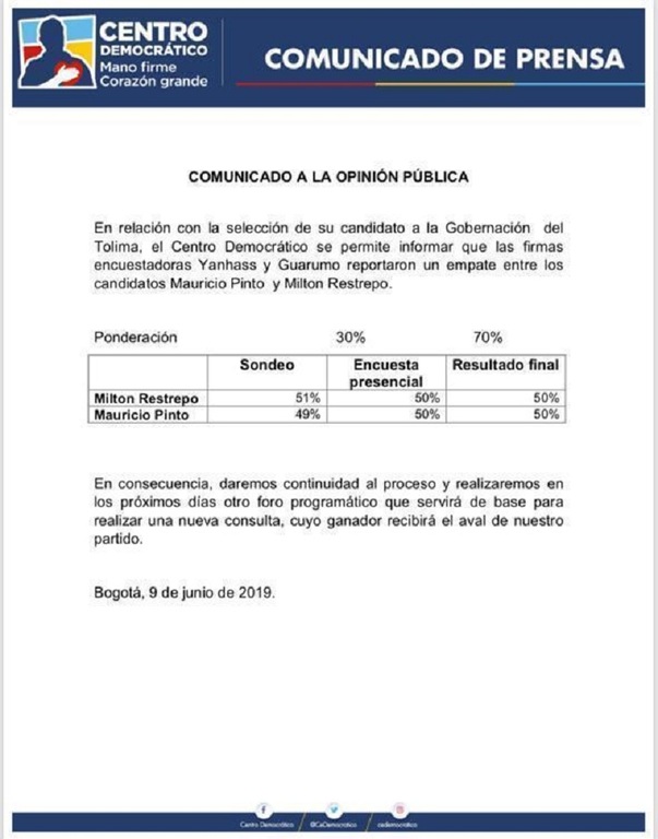 El resultado final de la encuesta realizada en el Centro Democrático para escoger candidato a la gobernación del Tolima fue de un EMPATE, según boletín expedido en las últimas horas por ese partido, donde dice que así lo señalan las firmas encuestadoras: Yanhass y Guarumo, donde se señala que tanto Milton Restrepo como Mauricio Pinto, obtuvieron en resultado del 50 por ciento cada uno.
